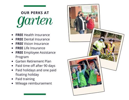 Garten believes in fostering a workplace that recognizes talent, encourages innovation, and celebrates achievement. We are proud to focus on hiring people with disabilities. We also strive to ensure a welcoming and fair process for all qualified applicants. Our mission is to empower every employee to succeed and contribute to our organization’s achievements. If you need assistance or accommodations during the job application or interview process, please contact our Recruitment team at recruitment@garten.org.